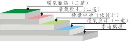 2.環(huán)氧底漆:采用滲透性及附著力特強環(huán)氧底漆滾涂一道,增強表面附著力;